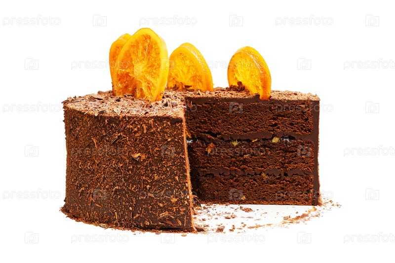 Верх шоколадного торта, украшенный карамелизированными дольками апельсина