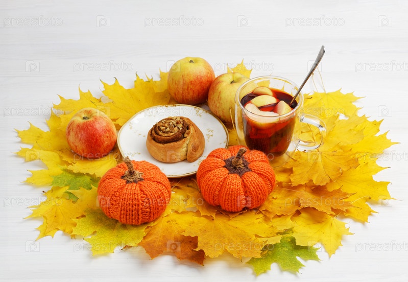 Две игрушечные вязаные тыквы, булочка с корицей и чашка глинтвейна на куче желтых осенних листьев