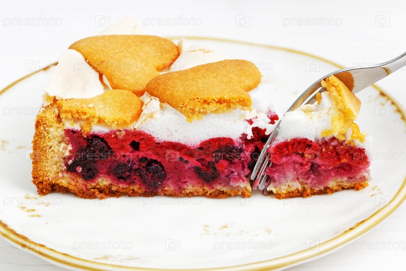 Кусок крупного плана домашнего ягодного пирога с безе и печеньем на белом деревянном столе. Мелкий фокус