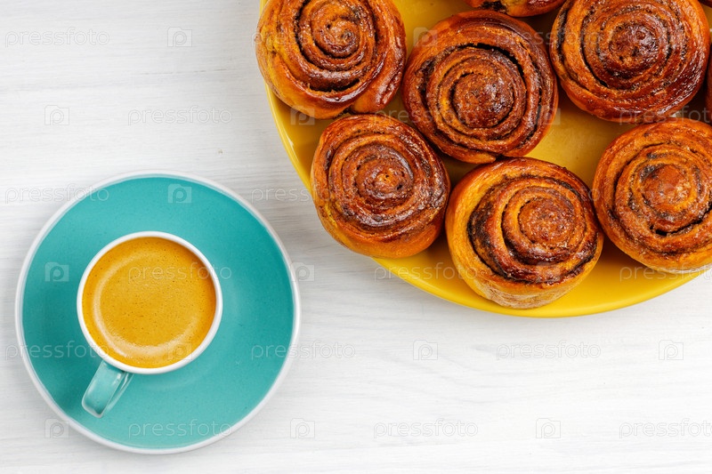 Домашние булочки с корицей из дрожжевого теста и чашка кофе эспрессо на белом деревянном столе. Вид сверху