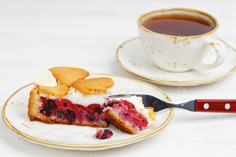 Кусок домашнего ягодного пирога с безе и печеньем на белом деревянном столе. Мелкий фокус