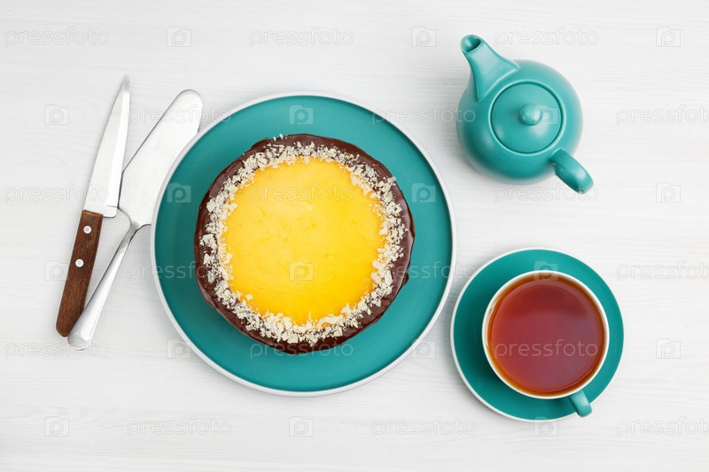 Домашний чизкейк с шоколадом и апельсином, посыпанный ломтиками миндаля и чашкой чая на белом деревянном столе. Вид сверху