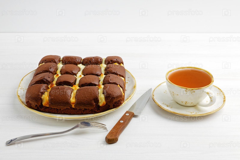 Домашний чизкейк шоколадного пирога и чашка чая на белом деревянном столе