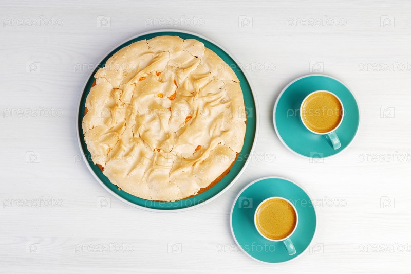 Домашний ягодный торт с безе и две чашки кофе эспрессо на белом деревянном столе. Вид сверху