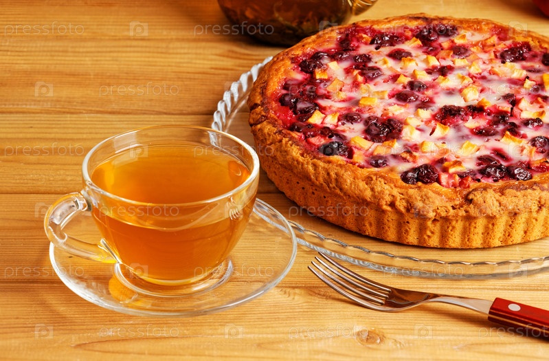 Крупный план домашний вишневый и яблочный пирог и чашка чая на деревянном столе