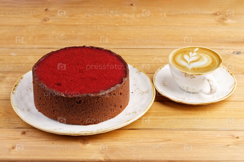 Домашний малиновый и клубничный чизкейк и чашка кофе капучино на деревянном столе