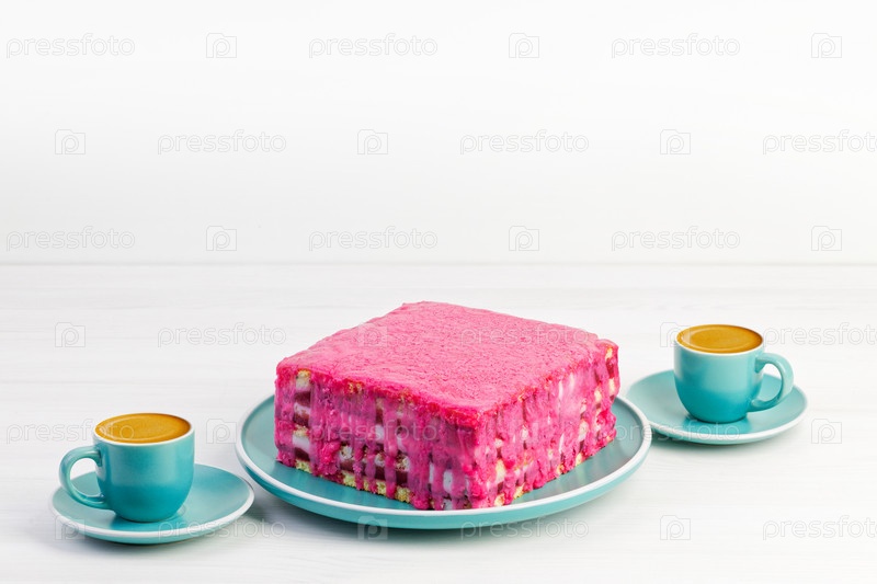 Домашний пирог поленики печенья и две чашки кофе эспрессо на белом деревянном столе. Копипространство