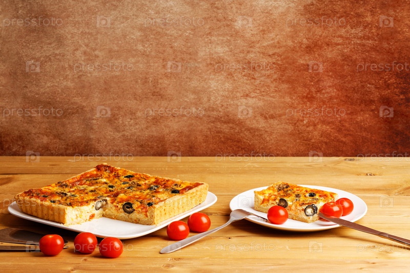 Домашний сырный пирог с заварным кремом с помидорами, шампиньонами и оливками на деревянном столе. Копипространство