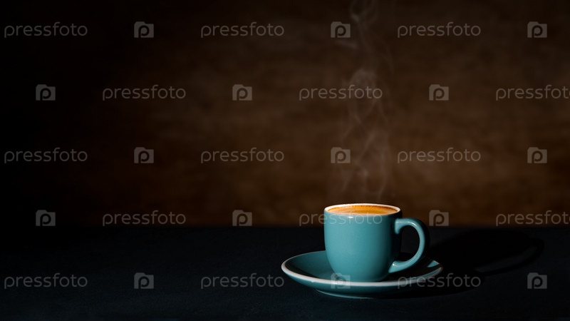 Дымящаяся чашка горячего кофе на темном размытом фоне