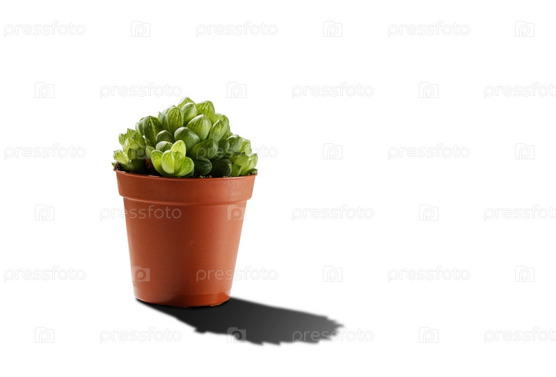 Маленькое зеленое сочное растение мини-алоэ в горшке изолировано на белом фоне с тенью. Копипространство
