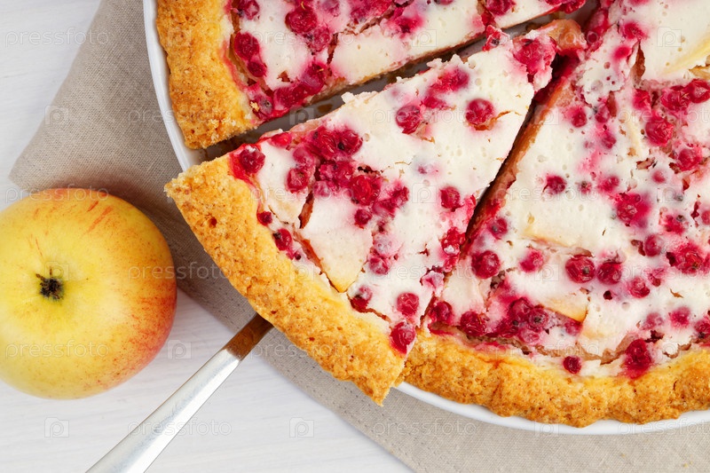 Крупным планом домашнее яблоко и пирог с красной смородиной на белом деревянном столе. Вид сверху