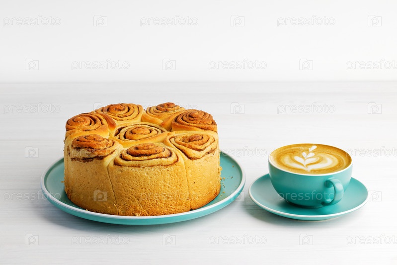 Домашние булочки с корицей из дрожжевого теста и чашка кофе капучино на белом деревянном столе. Копипространство