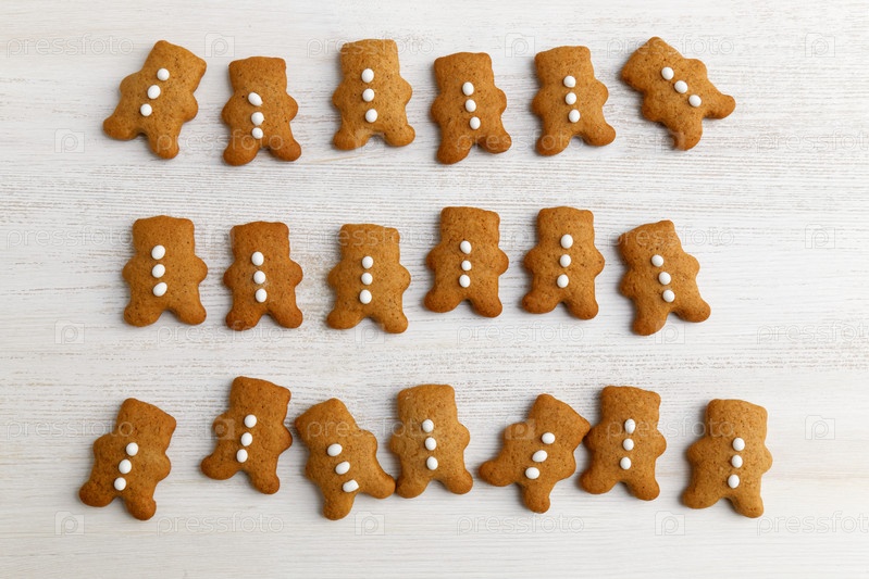 Пряники с медом и корицей в виде медведей, украшенные белой глазурью на белом деревянном столе