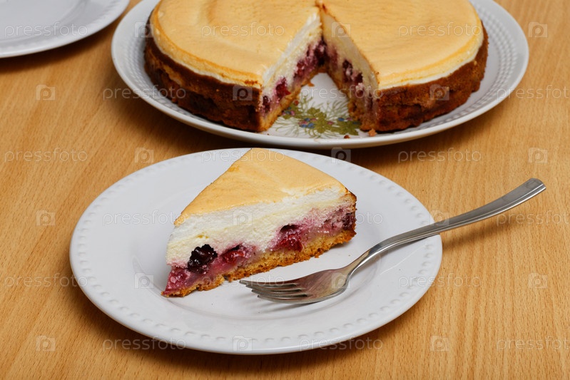 Кусок домашнего чизкейка с вишней, творогом и безе