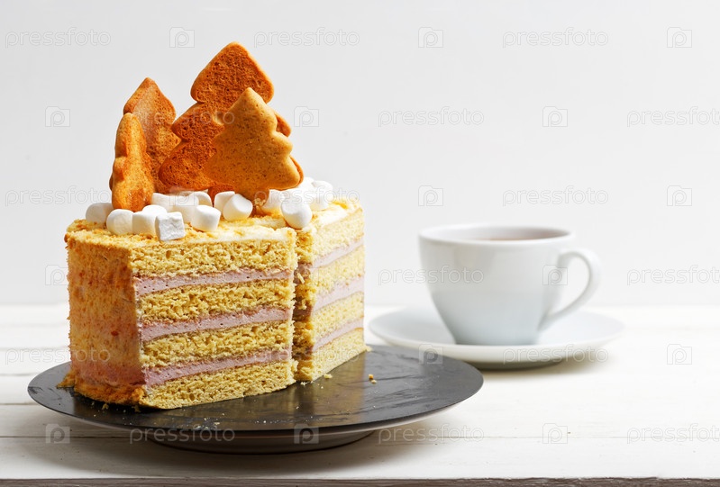 Домашний шоколадный чизкейк с ломтиками миндаля на белом деревянном столе. Вид сверху