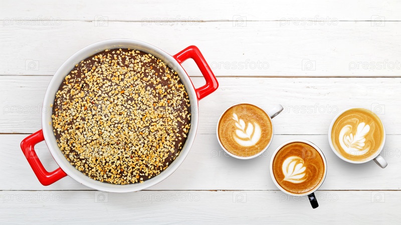 Домашний шоколадный чизкейк с ломтиками миндаля на белом деревянном столе. Вид сверху