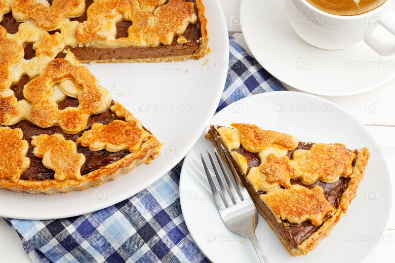 Домашний шоколадный чизкейк с ломтиками миндаля на белом деревянном столе. Вид сверху