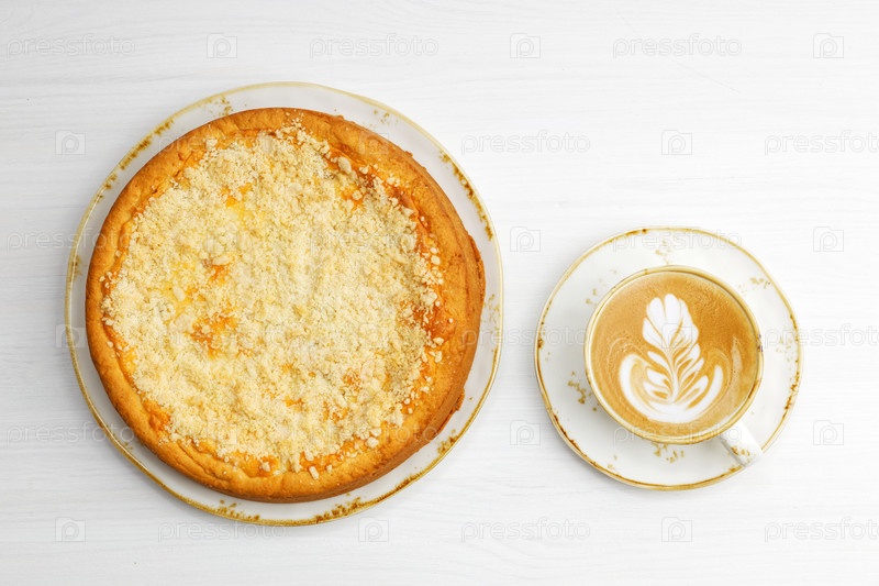 Домашний шоколадный чизкейк с ломтиками миндаля на белом деревянном столе. Вид сверху