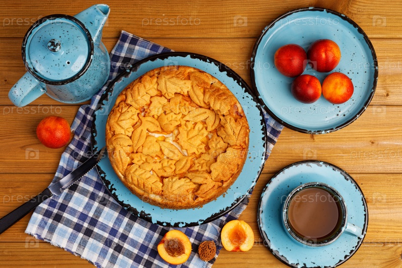 Домашний пирог с нектаринами и чашкой чая на деревянном столе. Вид сверху