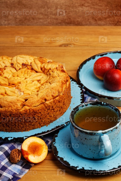 Крупный план домашний пирог с нектаринами и чашкой чая на деревянном столе. Мелкий фокус