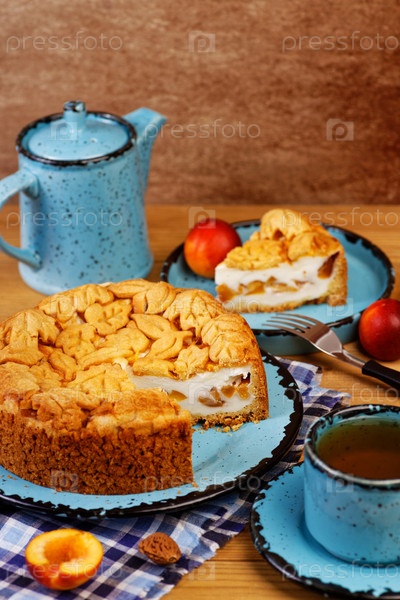 Крупный план домашний пирог с нектаринами и чашкой чая на деревянном столе. Мелкий фокус