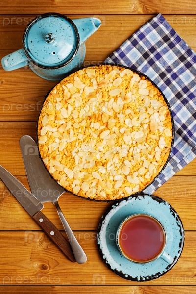 Домашний торт с черной смородиной, украшенный миндальными лепестками и чашкой чая на деревянном столе. Вид сверху