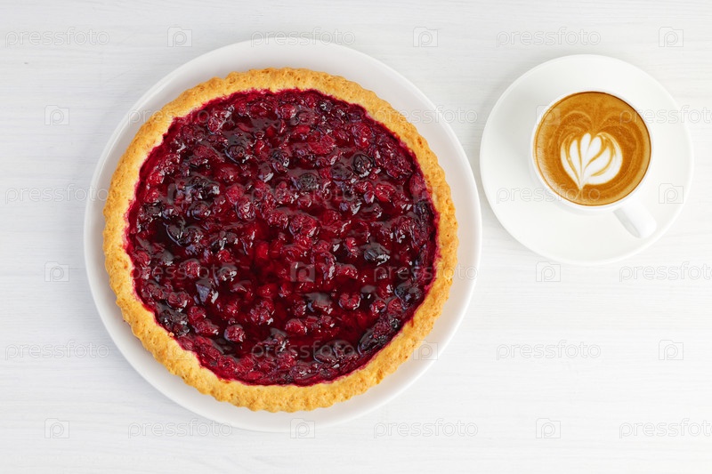 Домашний ягодный пирог с вишней и чашкой кофе капучино на белом деревянном столе. Вид сверху