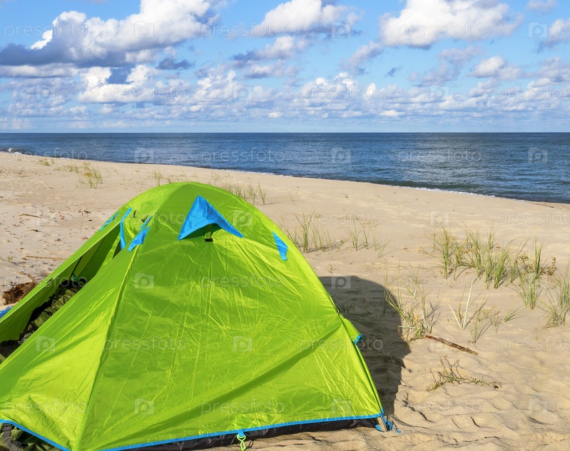 Зеленая палатка на морском песке. Походная палатка на берегу. Балтийское побережье тихое море