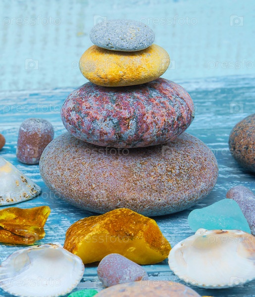 Пирамида из морских камней на синем фоне. Морская галька и ракушки на столе