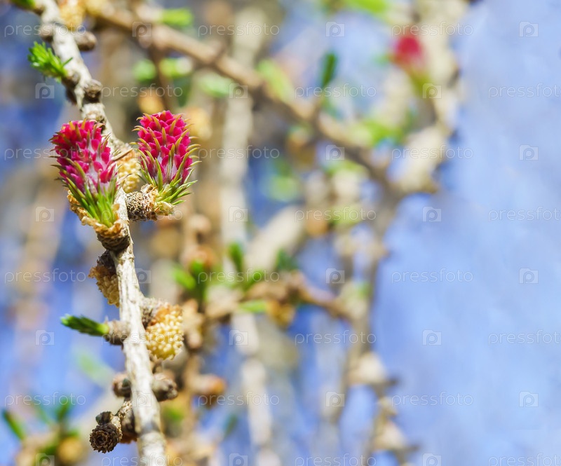 Лиственница весеннего цветения. Красные бутоны на хвойном дереве