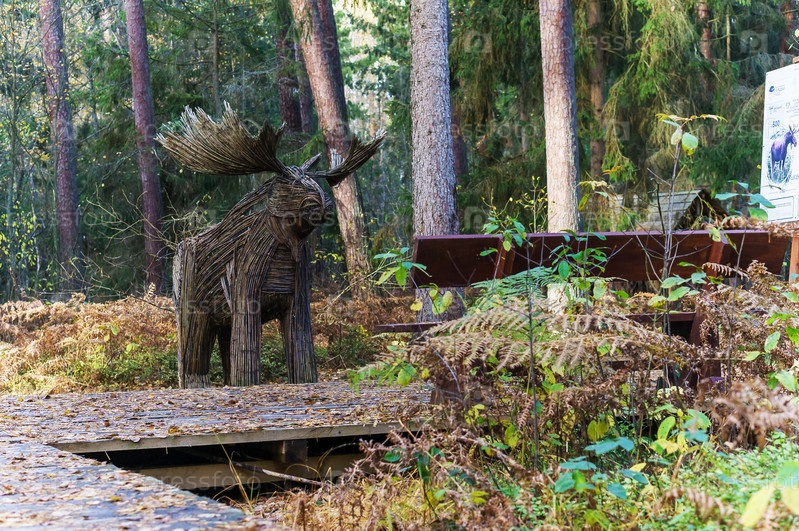 Экологический маршрут в лесу. Арт-объект - лось, сплетенный из веток лозы. Автор Кристина Евстигнеева. Куршская коса, Королевский лес, Калининградская область, Россия, 24 октября 2021 г