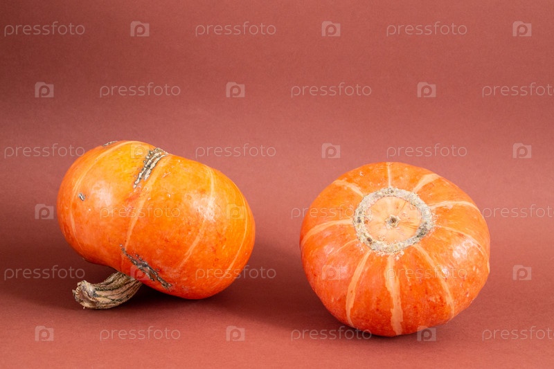 Оранжевая тыква на коричневом фоне, пустое место для текста, естественный солнечный свет