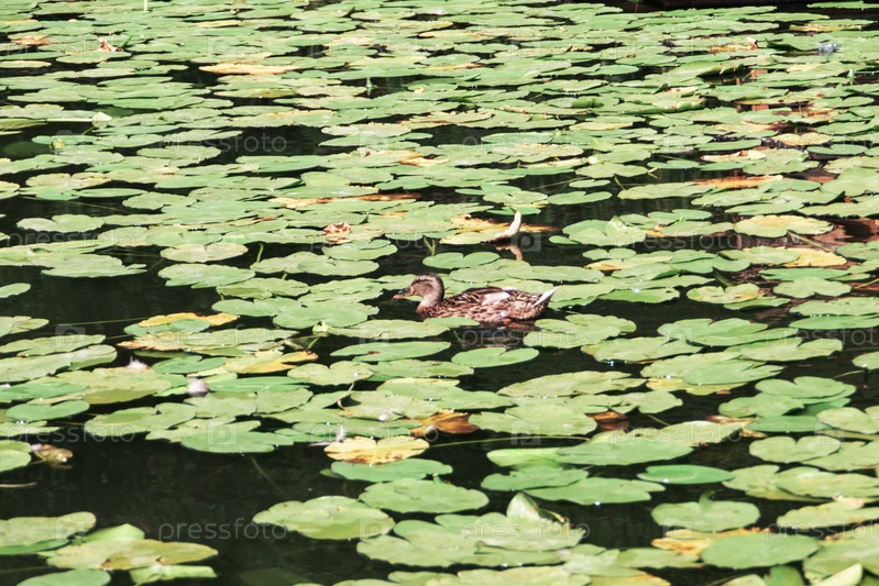 Пруд с водяной лилией с утками, летний загородный пейзаж
