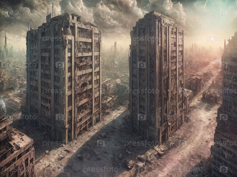 Плохая ненастная погода при закате солнца, апокалиптическая архитектура, группа высоких зданий посреди города, цифровое искусство, пост ядерные заброшенные архитектурные здания, последний день на земле, руины. Генерация искусственного интеллекта
