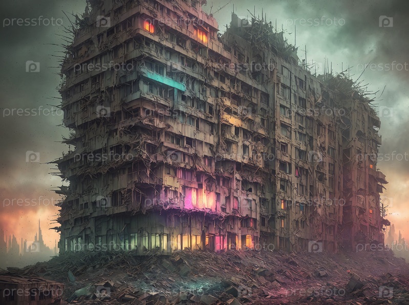 Плохая ненастная погода при закате солнца, апокалиптическая архитектура, группа высоких зданий посреди города, цифровое искусство, пост ядерные заброшенные архитектурные здания, последний день на земле, руины. Генерация искусственного интеллекта