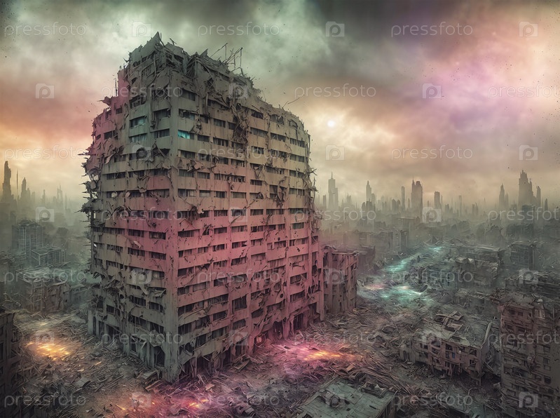 Плохая ненастная погода при закате солнца, апокалиптическая архитектура, группа высоких зданий посреди города, цифровое искусство, пост ядерные заброшенные архитектурные здания, последний день на земле, руины. Генерация искусственного интеллекта