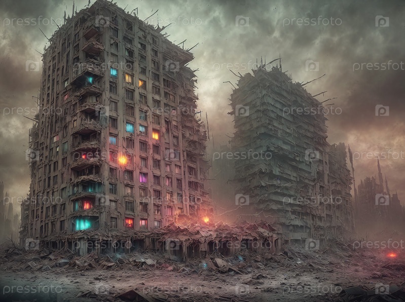 Плохая ненастная погода при закате солнца, апокалиптическая архитектура, группа высоких зданий посреди города, цифровое искусство, пост ядерные заброшенные архитектурные здания, последний день на земле, руины. Генерация искусственного интеллекта