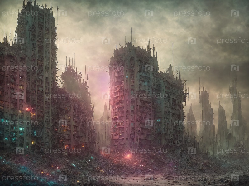 Плохая ненастная погода при закате солнца, апокалиптическая архитектура, группа высоких зданий посреди города, цифровое искусство, пост ядерные заброшенные архитектурные здания, последний день на земле, руины. Генерация искусственного интеллекта