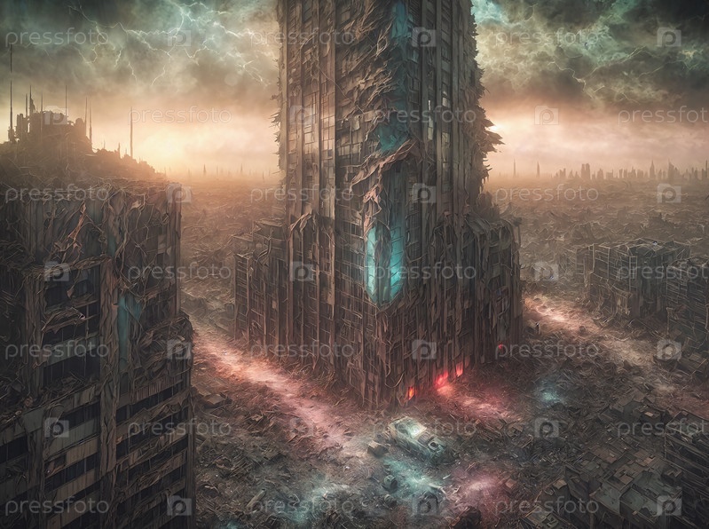 Плохая ненастная погода при закате солнца, апокалиптическая архитектура, группа высоких зданий посреди города, цифровое искусство, пост ядерные заброшенные архитектурные здания, последний день на земле, руины. Генерация искусственного интеллекта
