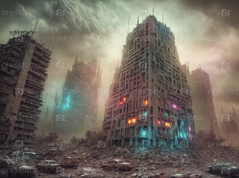 Плохая ненастная погода при закате солнца, апокалиптическая архитектура, группа высоких зданий посреди города, цифровое искусство, пост ядерные заброшенные архитектурные здания, последний день на земле, руины. Генерация искусственного интеллекта