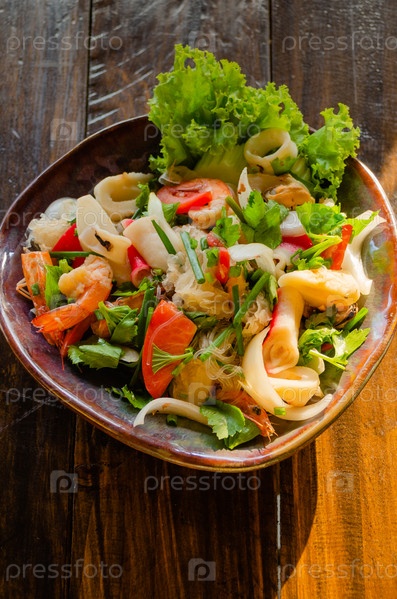 Традиционная тайская кухня. Крупный план салата из фунчозы с морепродуктами на деревянном столе в тайском кафе, вид сверху