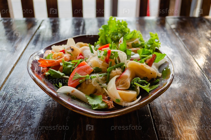 Традиционная тайская кухня. Крупный план салата из фунчозы с морепродуктами на деревянном столе в тайском кафе. Вкусная азиатская еда из морепродуктов, фунчозы, овощей и зелени