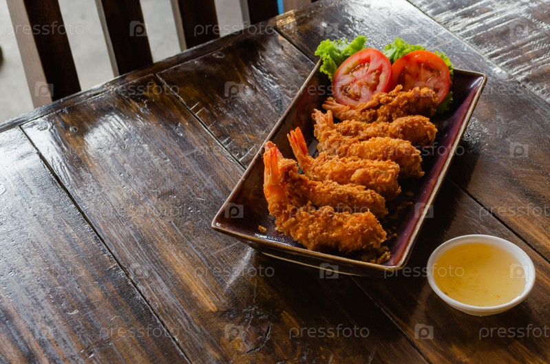Традиционная тайская еда. Вкусные креветки в кляре на деревянном столе крупным планом