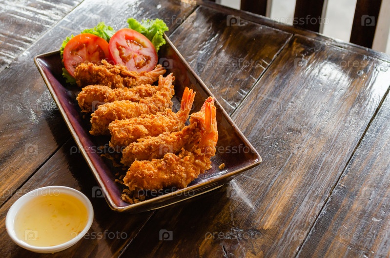 Традиционная тайская еда. Вкусные креветки в кляре на деревянном столе крупным планом