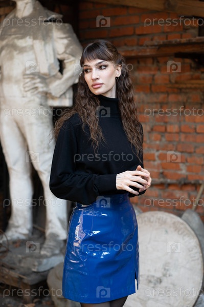 Молодая красивая женщина позирует в черном свитере на улице