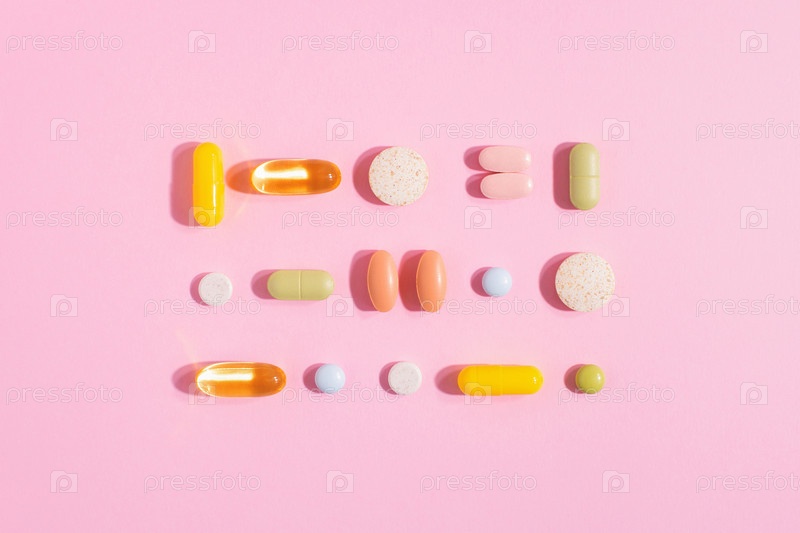 Медицинские аптечные таблетки, таблетки и капсулы, изолированные на розовом фоне