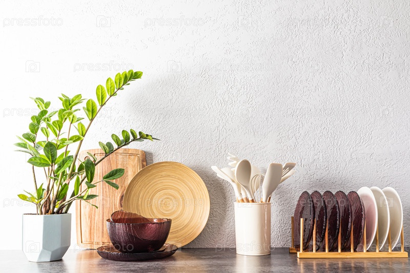 Различная кухонная экологически чистая посуда из дерева и стекла на кухонной столешнице. интерьер современной кухни. комнатный цветок