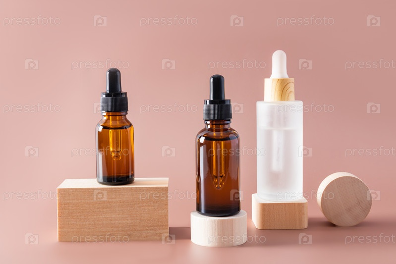 Различные косметические флаконы с капельницей с органическим натуральным средством по уходу за лицом стоят на геометрических деревянных фигурах. передний план