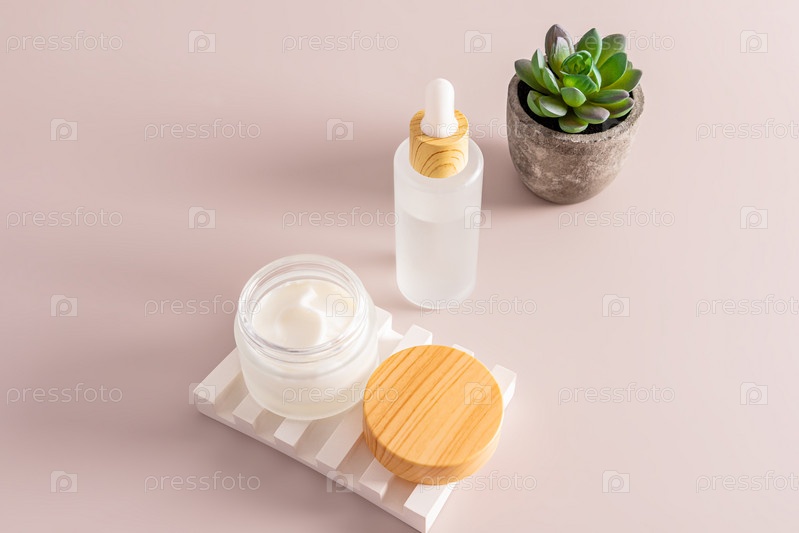 Открытая матовая банка с увлажняющим кремом на гипсовом рельефном подиуме и сыворотка в белой матовой бутылке на бежевом фоне. косметический уход