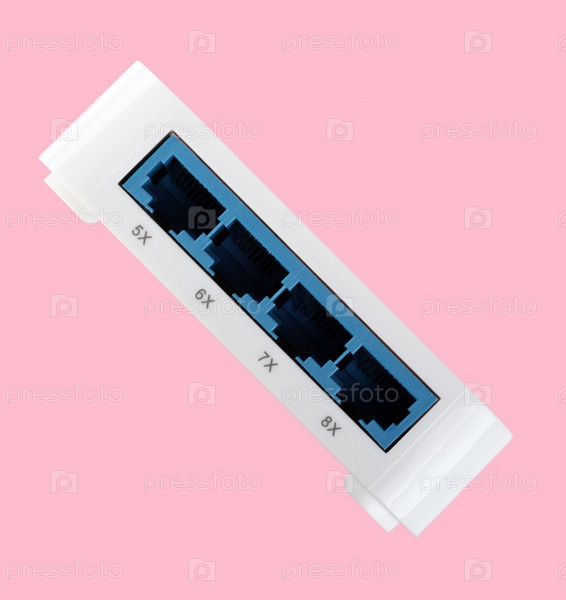 Белый 8-портный пластиковый коммутатор Ethernet изолирован на розовом фоне в сухой день